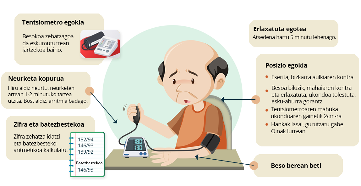- Beso bat ala bestea aukeratzea: baliteke balioak desberdinak izatea beso batean eta bestean; horregatik, tentsioa beti beso berean neurtzea gomendatzen da. Zifra altuenak ematen dituen besoa aukeratu ohi da.