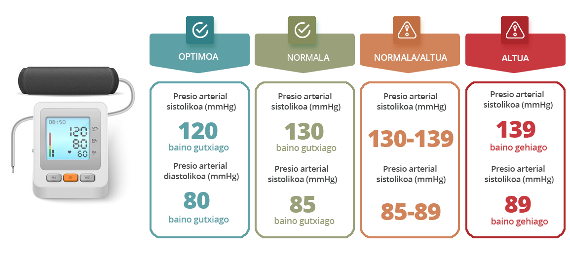 Tratamenduaren beste oinarrietako bat da tentsioari eustea gomendatutako mugetan, oro har, 140/90 mmHg-tik behera. Artatzen zaituen osasun-taldeak esango dizu zein diren balio onargarriak.