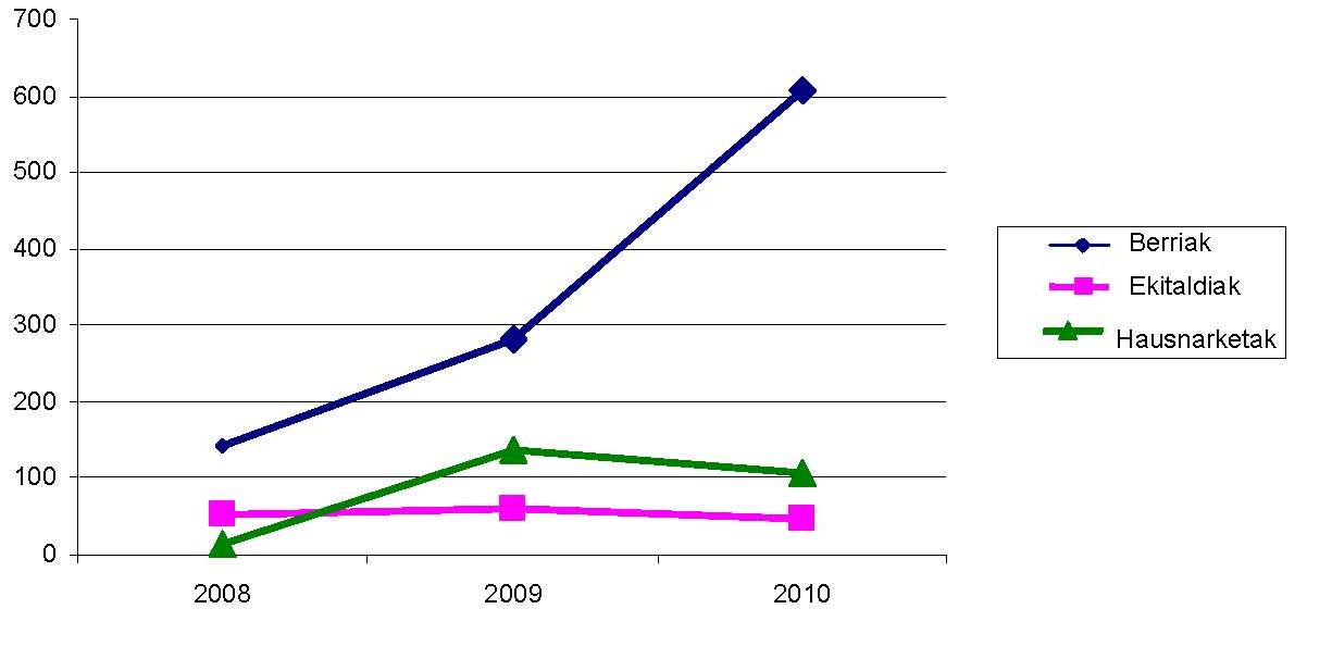 - Jarduerak gora egin du, albisteak, ekitaldiak eta gogoeta identifikatzeari dagokionez. Horren erakusgarri da 2008, 2009 eta 2010 urteetako datuak jasotzen dituen grafiko hau (1. grafikoa):