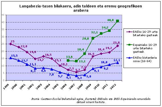 Eustatek Gazteen Euskal Behatokiari emandako datuen arabera, 2012an 16 eta 29 urte bitarteko gazteen langabezia-tasa % 23,8koa izan da. Langabezia-tasa horrek lan egiteko prest dauden baina, nahiz eta aktiboki bila ibili (azken lau asteetan lana aurkitzeko gestioren bat egin dute), lanik ez duten gazteen ehunekoa adierazten du; hau da, ez dira kontuan hartzen lan bila ez dabiltzan ikasleak ezta lan egin ezin duten gazte ezgaituak ere. Beraz, esan dezakegu 2012an lan egin ahal eta nahi duten gazteen laurden batek ez duela lanik.