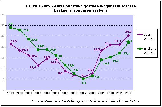 Gazteen langabezia-tasaren bilakaera sexuaren arabera aztertzen badugu, ikus dezakegu 2012an gizonezkoen tasa emakumezkoena baino pixka bat altuagoa dela. 2007 arte langabeziak eragin handiagoa izaten zuen emakumeen artean, baina ordutik hona joeraren aldaketa nabaritzen da eta azken urteotan gizonezkoen tasak emakumezkoenak baino handiagoak dira. (Azterketa hau egiteko Eustatek 16 eta 29 urte bitarteko gazteei buruz emandako datuak erabili ditugu. Datuok Gazteen Euskal Behatokiaren estatistika arloaren barruan aurki daitezke).