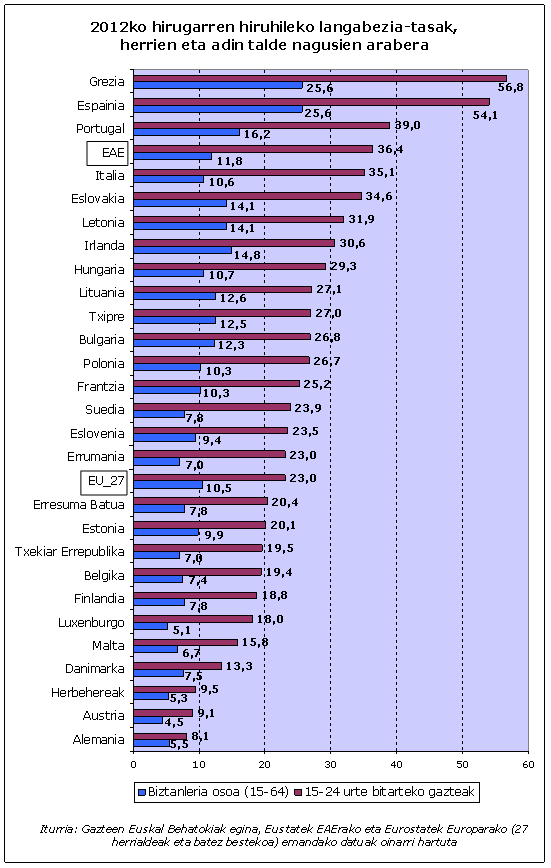 EAEko gazteen langabezia-tasak Europako estatuetan dagoenarekin konparatu ahal izateko, 25 urtetik beherakoenak hartu behar ditugu, Eurostatek, Europako bulego estatistikoak, horrela kaleratzen baititu. EAEn Eustatek adin tarte horretarako zabaldutako datuak oinarri hartuta, esan dezakegu EAEko 16 eta 24 urte bitarteko gazteen langabezia-tasak 2012ko hirugarren hiruhilekoan (Europa mailan ez dago datu berriagorik) Europar Batasuneko laugarrenak direla tasa handienetatik hasita.