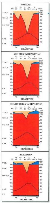a.- Behatoki osoak edo lehen mailakoak. Igeldo-Donostia, Vitoria-Gasteiz, Sondika, Iruñea eta Hondarribiko meteorologia behatokiak bakarrik dira era honetakoak. Behatoki hauetan ondoko aldagaiei buruzko datuak biltzen dira: prezipitazioak (isurkari zein gotorrak); euri egunen kopurua; urteko, hilabeteko eta eguneko prezipitazioen batez besteko intentsitatea; epe laburretan zeharreko intentsitate gorenak (Igeldoko plubiografoa); tenperatura; lainoa; izozteak; hodeiak; ihintza; hezetasuna; haizea (norabidea, indarra eta maiztasuna) eta ebapotranspirazioa.