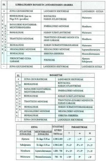 Landaredi estaiak bereizteko tenperatura datu jakin batzuk hartzen dira kontuan: urteko batez besteko tenperatura (T), hilabete hotzenari dagokion tenperatura txikiena (m) eta hilabete horretako tenperatura handienen batez bestekoa (M). Gauzak argitzeko, ondoko taula honetan Euskal Herriko landaredi estai bakoitzari gutxi gorabehera dagokion garaiera zehaztu da.Landaredi estaiak bereiztea, baina, ez da aski eskualde jakin bateko landaredi aldaera guztiak bereizteko. Bizkaian, adibidez, kare harrizko mendi mazel ez-oso-garaietan artadiak hazten dira, eta horien garaiera berdintsuko bestelako mendietan, berriz, hariztiak.