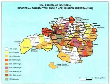 Enplegu/lantegien batez bestekoak gora egin du, 1978-an 21,5 zen eta laurogeita hamarreko hamarraldian 48raino igo zen; lantegiak handitu egin direla adierazten du horrek, baina datu hori ez da zehatza, bost enplegatu baino gutxiago duten laurogeita hamar lantegi estatistika horretan jasoak ez daudelako.Lantegi/enplegua erlazioari dagokionez, laurogeita hamarreko hamarraldian lantegien %12,5ek 5etik 9 enplegatu bitarte zituzten eta industriako enpleguaren %1,8 biltzen zuten; %70,9k 10etik 49ra enplegatu zituzten eta enpleguaren %28,3 biltzen zuten; %7,9k 50etik 99ra enplegatu zituzten eta enpleguaren %11,5 biltzen zuten; %7,3k 100etik 499ra enplegatu zituzten eta enpleguaren %32,1 biltzen zuten; eta % 1,4 lantegi besterik ez ziren 500 enplegatutik gora zituztenak, industria enplegu guztiaren %23,6 biltzen zutela. Enpresa txikia da beraz nagusi eta sektore horretan daude lanposturik gehienak.