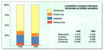 Lanean dihardutenen bi herenak ari dira hirugarren sektorean lanean (merkataritzan eta turismoan batez ere), lehen sektorean, berriz, %8. Bigarren sektorean lanpostuen galera hiru puntukoa izan zen (%20-tik %17,3-ra),1982ko datuekin konparatuz gero, baina 1954ko datuekin konparatuz gero, askoz lanpostu gehiago galdu dira, garai hartan langileen %26k lan egiten baitzuen sektore horretan.