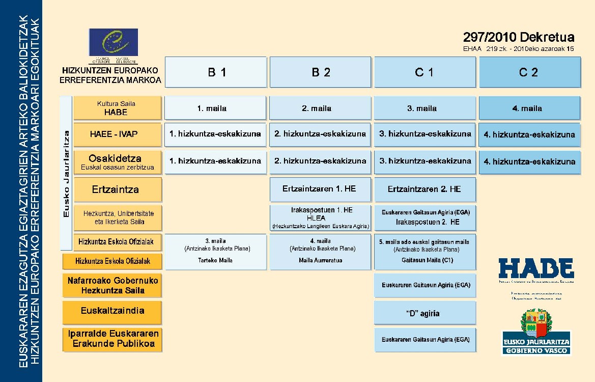 297/2010 DEKRETUA, azaroaren 9koa, euskararen jakite-maila egiaztatzen duten tituluak eta ziurtagiriak baliokidetu, eta Hizkuntzen Europako Erreferentzia Marko Bateratuko mailekin parekatzeko dena. (azaroaren 15eko EHAA, 219 zk.)