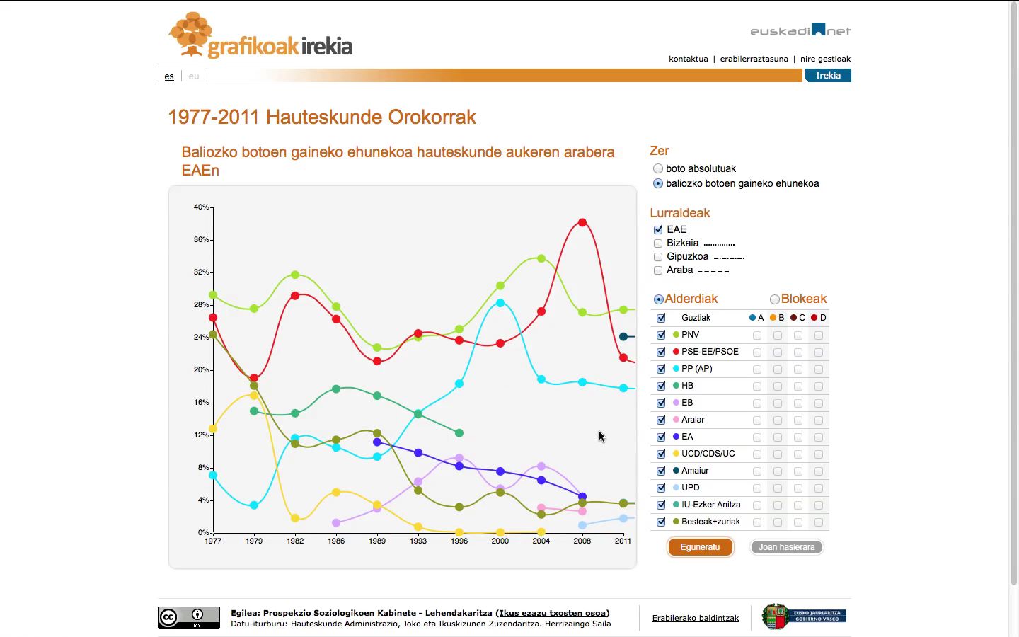 Eusko Jaurlaritzak Prospekzio Soziologikoen Kabinetearen eskutik azaroaren 20ko Hauteskunde Orokorren emaitzei buruzko txosten bat argitaratu du; txosten hori Herrizaingo Sailak emandako datuekin egina izan da. Web orri interaktibo baterako hainbat esteka jasoko ditu txosten horrek (http://grafikoak.irekia.euskadi.net/eu/charts), erabiltzaileek 1977tik aurrera izandako hauteskunde orokorren emaitzen bilakaerari buruzko grafikoak atera ditzaten erraztasunez. Grafiko horietan honako hauek aukeratu ahal izango dira: Zer (botoak guztira edo baliozko botoen gaineko portzentaiak), Non (EAE eta Lurralde Historikoak) eta Nortzuk (hauteskunde aukera bakoitza edo taldeka bilduta).