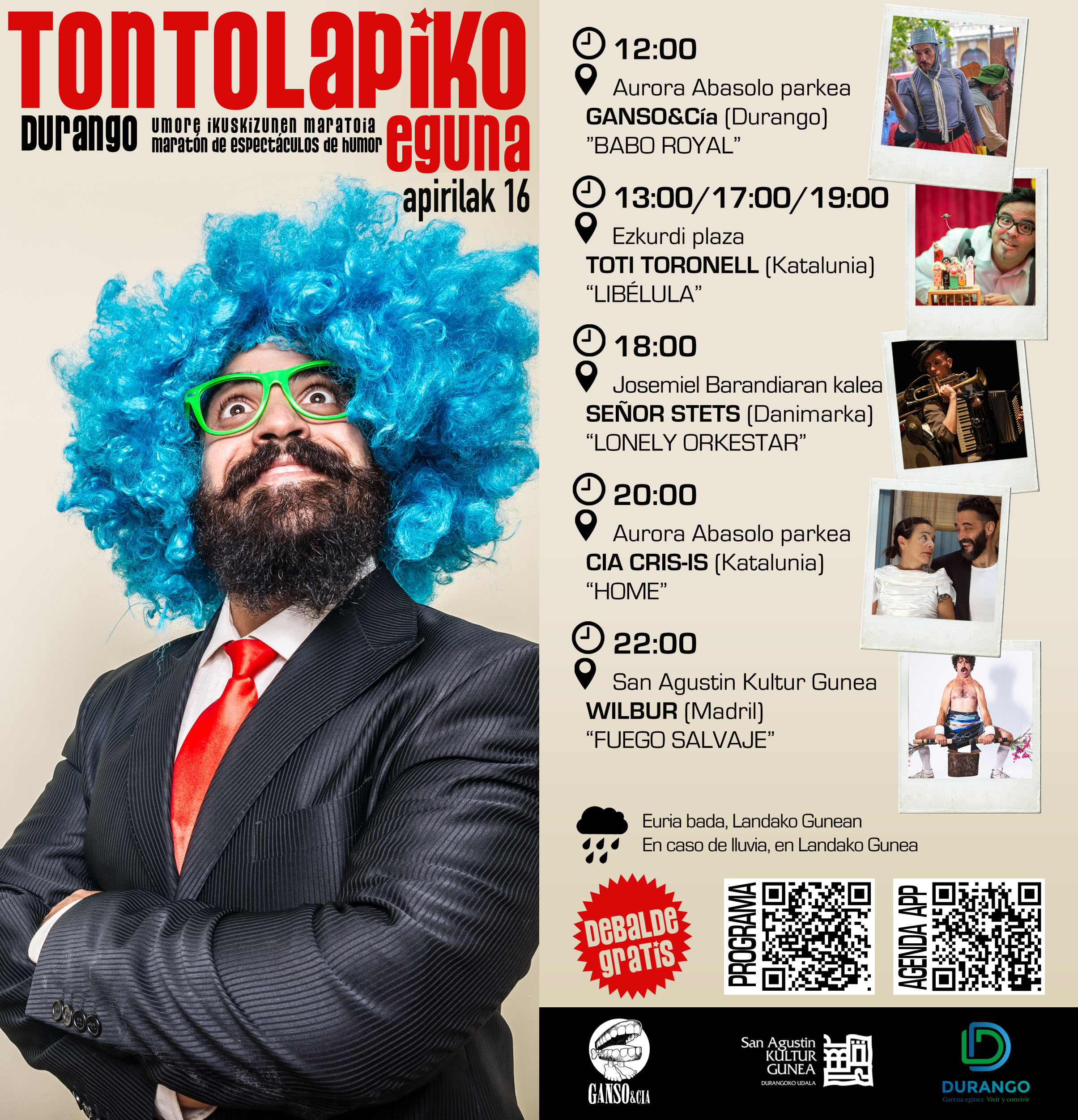 Tras la suspensión del habitual Topaklown por las consecuencias de la pandemia, el Ayuntamiento de Durango y la compañía Ganso&Cia han organizado el ‘Tontolapiko Eguna’ para el 16 de abril. Con esta iniciativa buscan mantener vivo el ya clásico espíritu clown que animaba Durango durante las vacaciones de Semana Santa, ofreciendo a la ciudadanía un maratón de espectáculos de humor para todas las edades. Un menú que comenzará a las 12 del mediodía y se prolongará hasta las 11 de la noche.