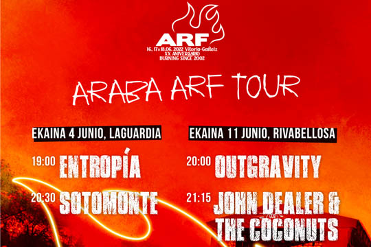 Aunque quedan menos de 20 días para la celebración del festival, sabemos que la espera se hace larga tras dos años sin pisar Mendizabala y, como aperitivo, llega la nueva programación de Araba ARF Tour. Cuatro conciertos gratuitos en dos localidades alavesas, de la mano de la Diputación Foral de Álava, abren la ruta al Azkena Rock Festival. El sábado 4 de junio, en Laguardia, en la Plaza Nueva, contaremos con Sotomonte, el brillante proyecto en solitario del getxoztarra Jokin Salaverria en el que se fusionan folk, rock y psicodelia, y Entropía, banda de space rock y sonidos psicodélicos surgida en la capital alavesa. El sábado siguiente, 11 de junio, la parada será en la Plaza de los Fueros de Rivabellosa con los gasteiztarras Outgravity, que actuaron en el ARF en 2019, y John Dealer & The Coconuts, punk rock euskaldun desde Legazpi con una base de fans que crece de manera meteórica.