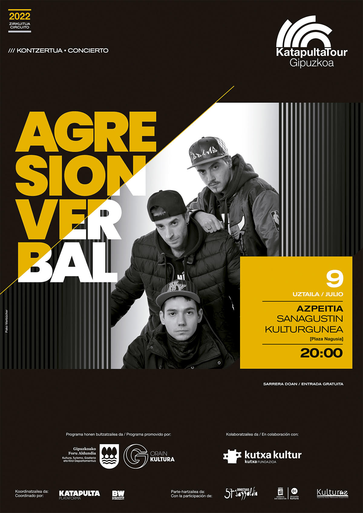 AGRESIÓN VERBAL es un grupo de rap de Zumárraga formado por Ziso, Mad Shayam y Dj Sbans. Crearon el grupo en el año 2005 debido a su pasión por la música y todo lo que rodea a la cultura urbana del Hip Hop. Tras años de trabajo y mejora en el mundo del rap en 2012 se dieron a conocer públicamente y empezaron a ofrecer sus primeros conciertos. Cuentan con 3 discos hasta la fecha. El primer disco se titula “Terapia Fría” y salió el año 2013. El segundo, “Revolución del Estilo” lo publicaron en el año 2015, con este disco demostraron la gran variedad de estilo y la tremenda y potente puesta en escena que demostraban concierto tras concierto, ganándose un puesto entre los grupos de Euskadi. El tercer disco, “Archivos Desclasificados”, salió en 2019, en este disco invirtieron el trabajo de varios años y en el resultado se puede apreciar una gran