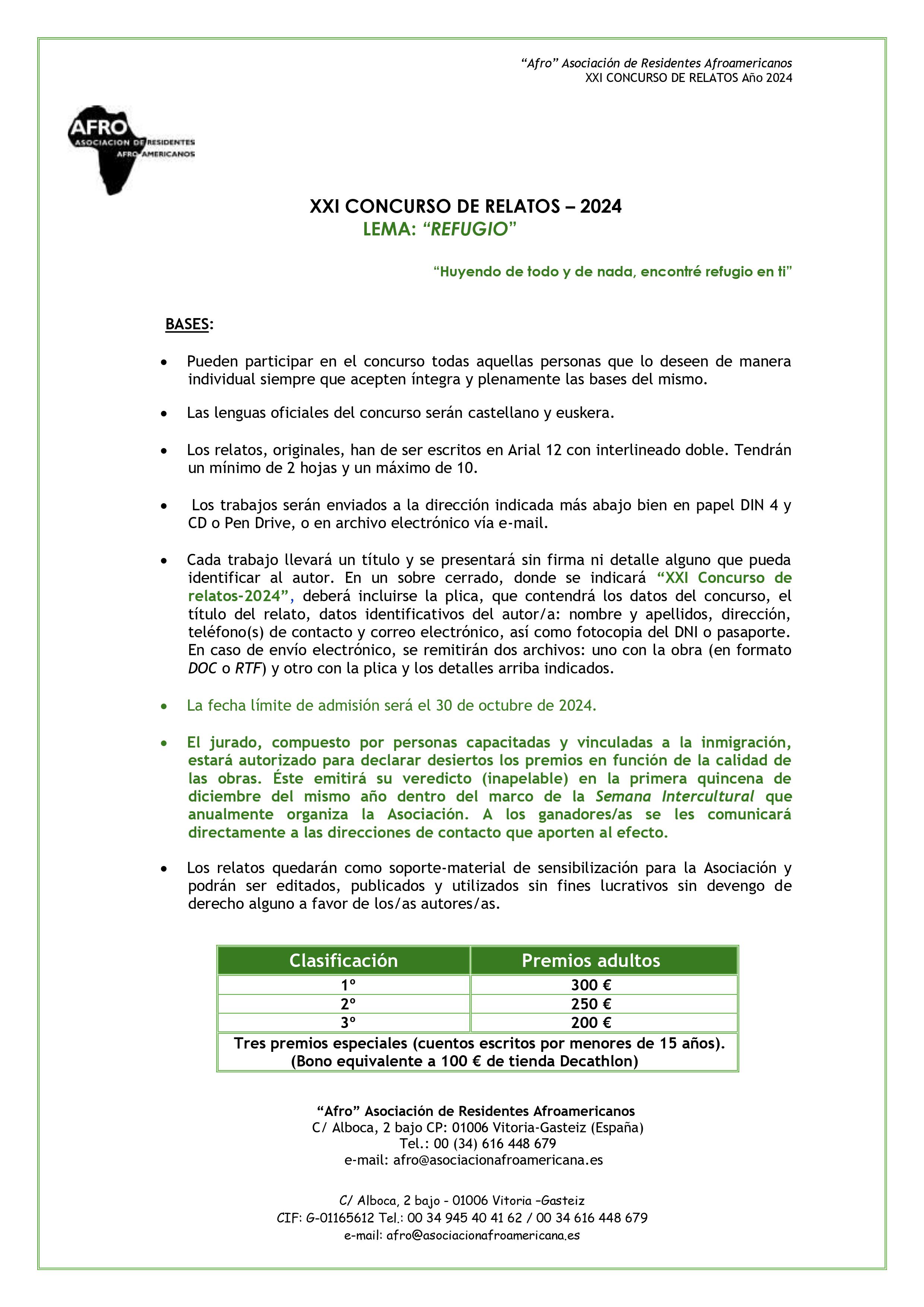 La Asociación de Residentes Afroamericanos presenta las bases del XXI Concurso Internacional de Relatos 2024, que tiene por título “Refugio”. Se invita a participar y reflexionar sobre el momento actual.