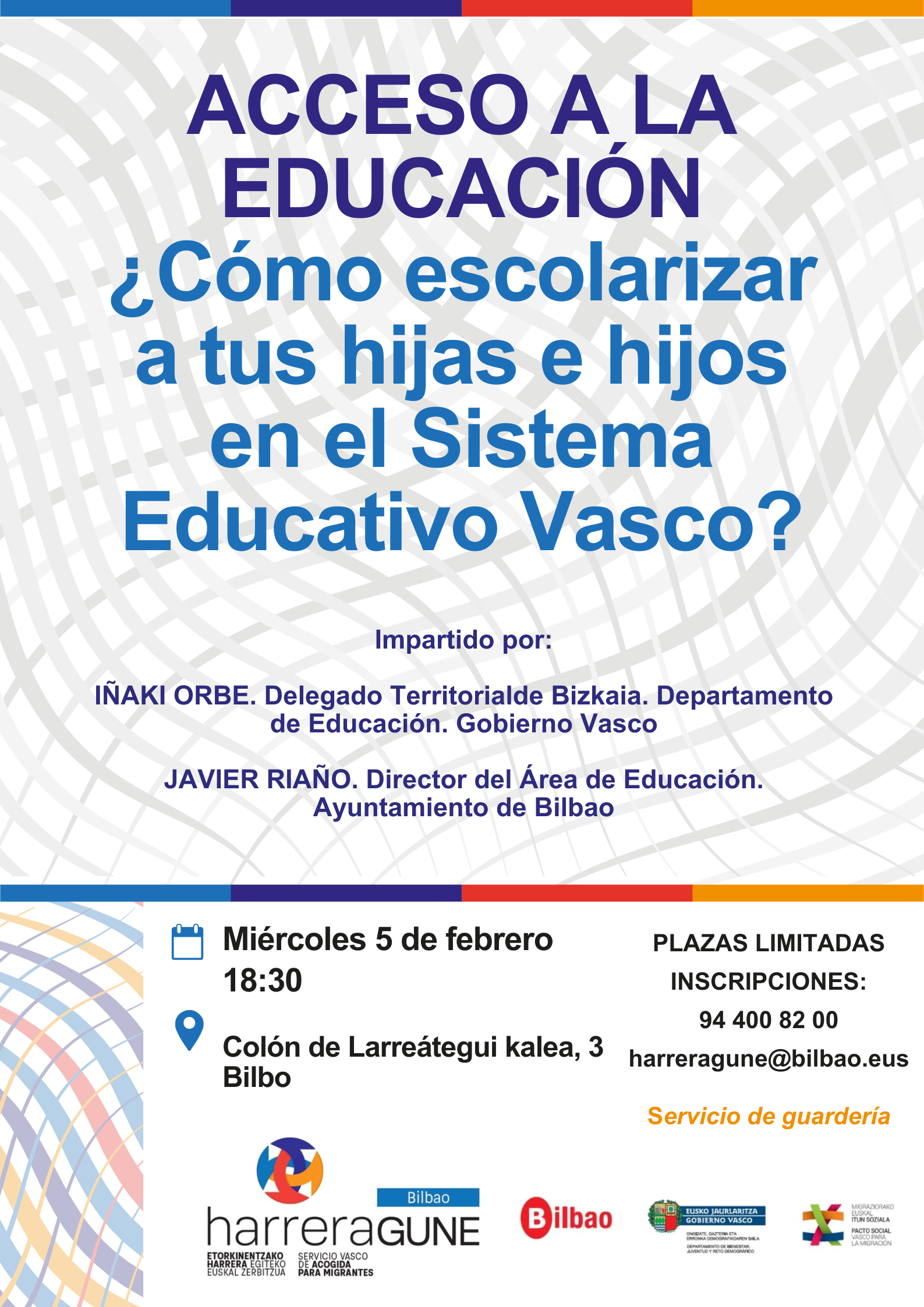 El próximo miércoles, 5 de febrero, a las 18:30, se celebrará un taller informativo sobre el proceso de escolarización en el Sistema Educativo Vasco. Durante la sesión, se ofrecerá información clave para las familias sobre cómo matricular a sus hijas e hijos, los criterios de admisión y los recursos disponibles en el sistema educativo.