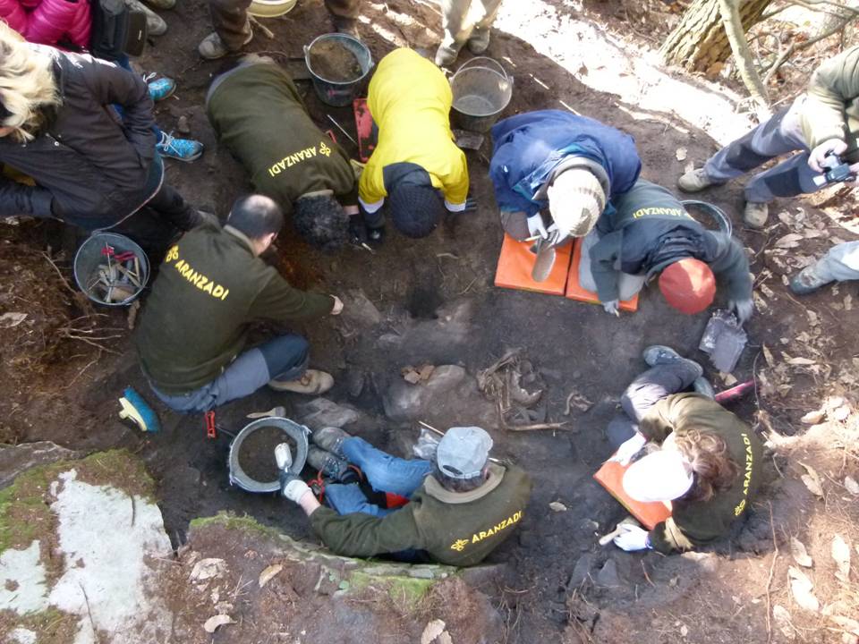 Además de miembros de la Sociedad de Ciencias Aranzadi y de Euskal Prospekzio Taldea colaboraron en los trabajos de exhumación y cribado de la tierra miembros de la asociación de Karraderan Elkartea de Larrabetzu.