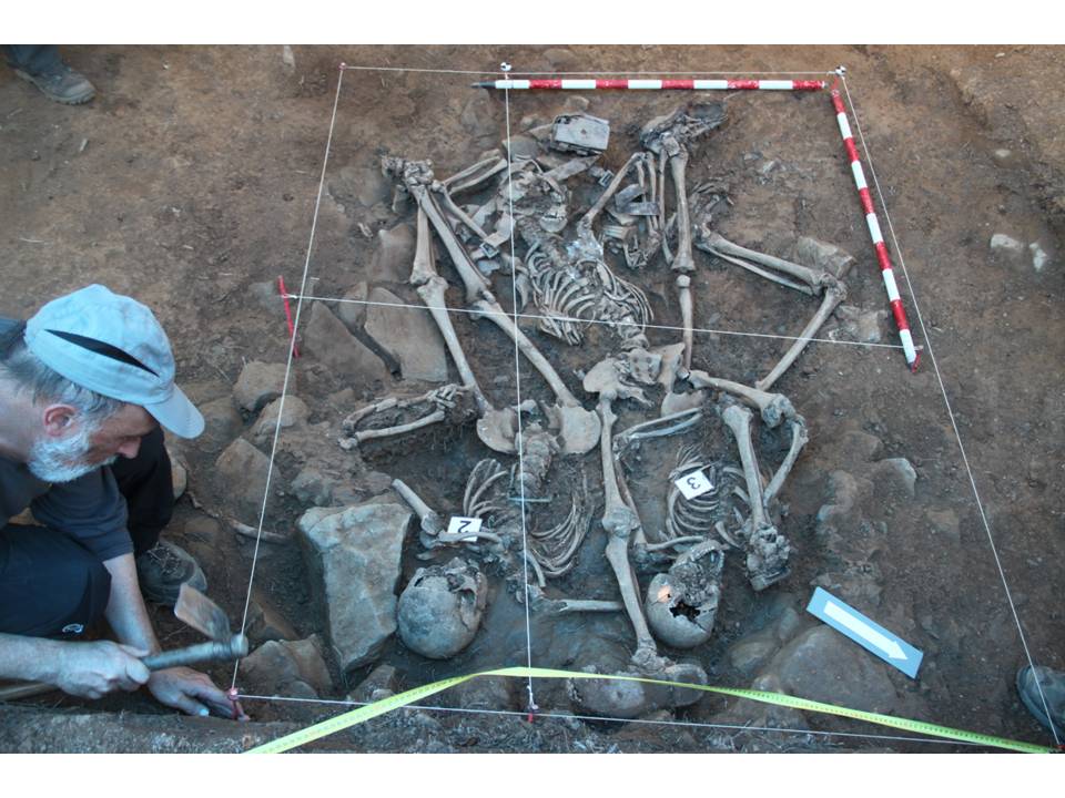 Individuo 3: Estaba colocado en decúbito supino. Individuo masculino subadulto, de edad inferior a los 20 años. No había completado la maduración esquelética. En relación con la causa de muerte se observó un orificio irregular de metralla en la parte posterior del cráneo.