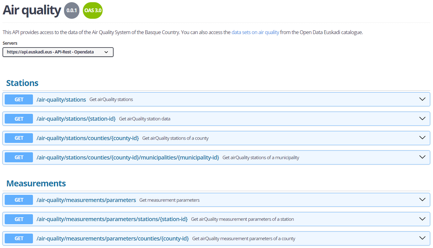 Hasta ahora los datos se podían descargar en los conjuntos de datos disponibles a través del catálogo de Open Data Euskadi en diversos formatos para su descarga (Excel, CSV y JSON). Sin embargo, a partir de ahora ya se encuentra disponible también una API Rest que permite realizar consultas por estación, municipio y territorio histórico (Araba, Bizkaia y Gipuzkoa), de forma que los datos se encuentran relacionados y se facilita el uso de los mismos a las personas reutilizadoras.
