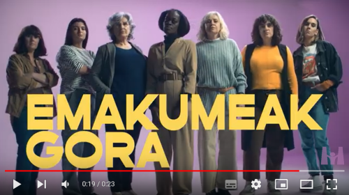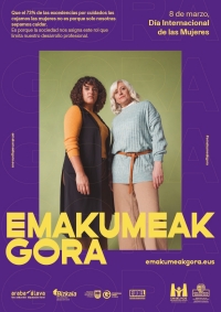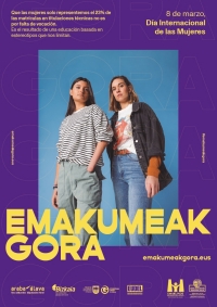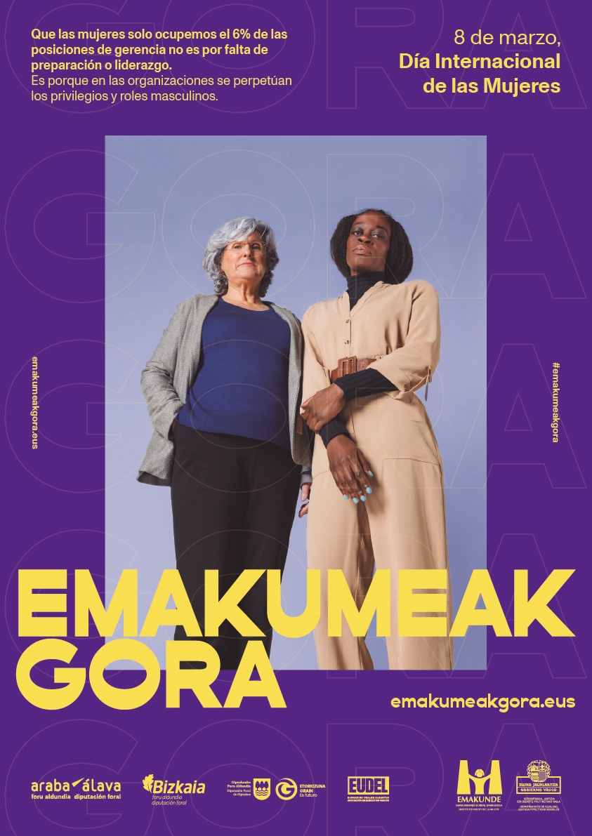 Emakumeak gora! es el lema de la campaña del 8 de Marzo, Día Internacional de las Mujeres que este año 2023 impulsa Emakunde conjuntamente con del Departamento de Igualdad, Justicia y Políticas Sociales; las tres diputaciones forales; EUDEL y los ayuntamientos de las tres capitales de la CAV. Este lema reivindica que la sociedad necesita más mujeres en puestos de decisión y de influencia.