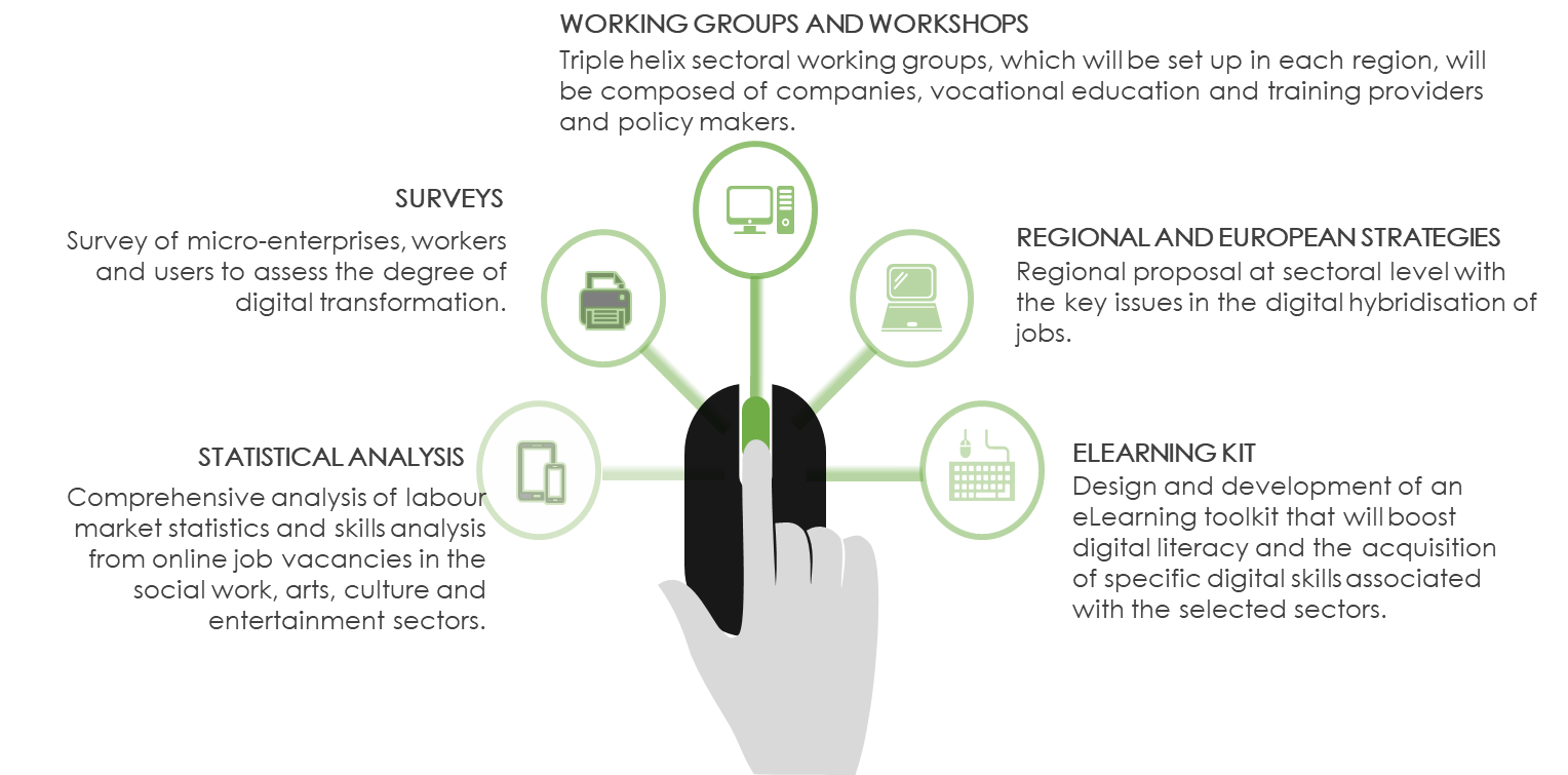 - To develop new digital approaches to training matching specific sectorial needs on social care and entertainment, arts and culture activities.