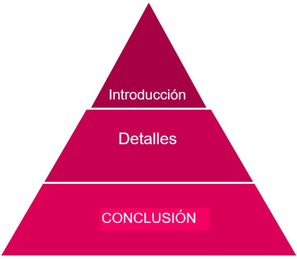 Cuando leemos un texto, estamos acostumbrados a que la disposición del contenido informativo siga un patrón determinado. Nos hemos habituado a que la información se estructure según el esquema Introducción > Detalles > Conclusión. Podemos representarlo gráficamente de la siguiente manera: