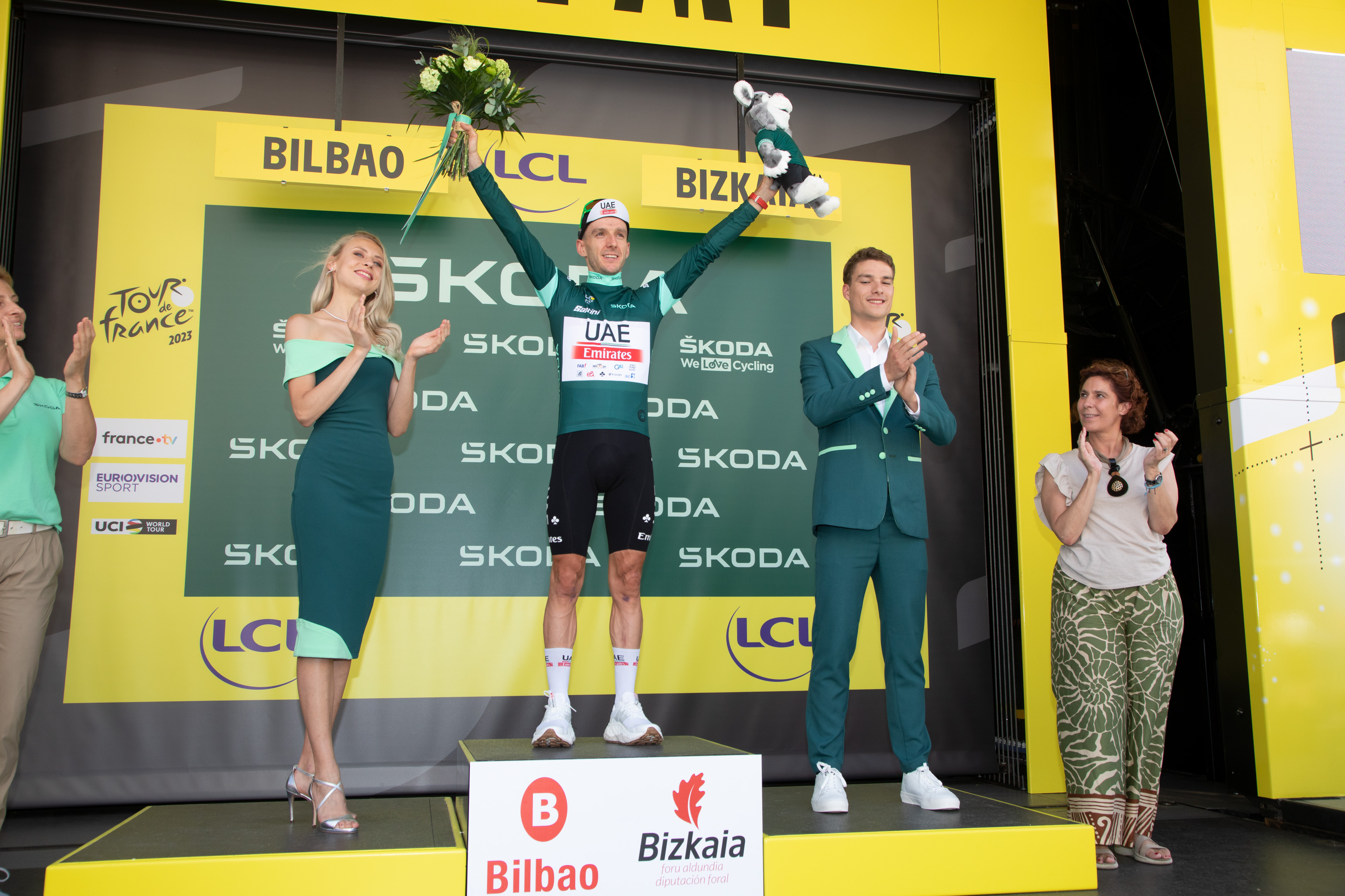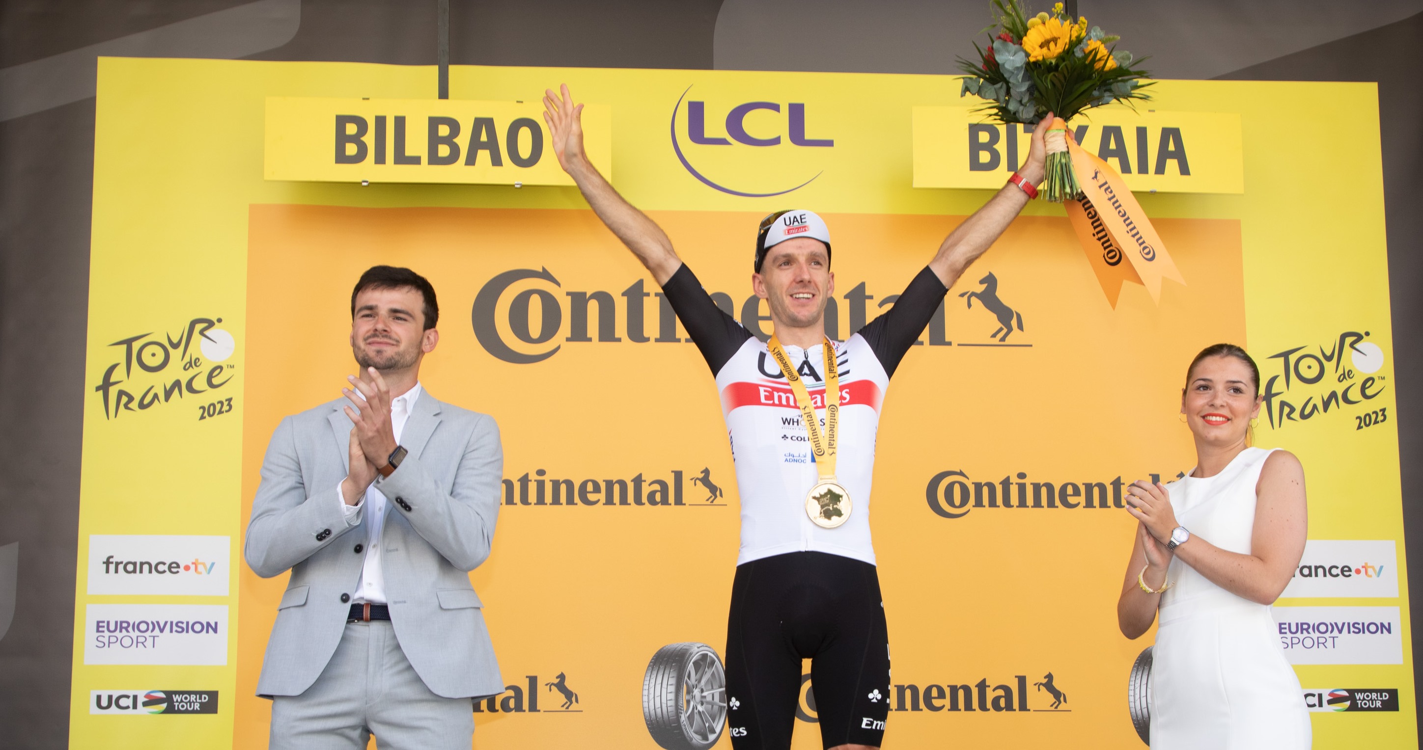 Finalmente, Adam Yates (UAE-Team Emirates) se ha impuesto en la jornada inaugural del Tour de Francia, Bilbao - Bilbao, un trazado de 182 kilómetros por carreteras de Bizkaia. El vencedor ha recibido el trofeo que le acredita como ganador de etapa de manos de Juan Mari Aburto, Alcalde de Bilbao, mientras que Elixabete Etxanobe, Diputada Foral de Administración Pública y Relaciones Institucionales, le ha entregado el maillot amarillo que le identifica como líder de la carrera.