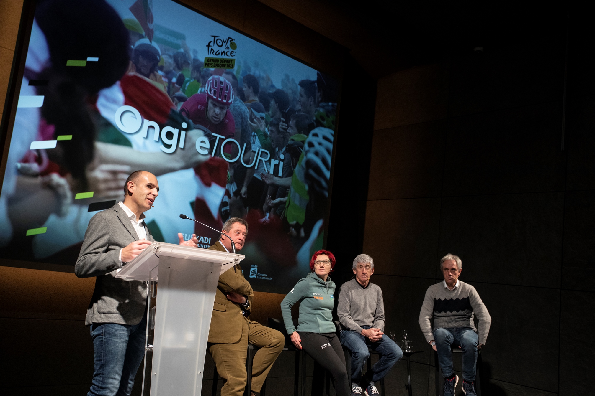 Tras la intervención del consejero se ha emitido el vídeo del Grand Départ Pays Basque, que ha puesto la piel de gallina a todas las y los asistentes, entre ellos, grandes nombres del ciclismo vasco. En el acto ha estado presente una reducida representación de ciclistas vascos y vascas con una relación muy estrecha con el Tour de Francia. Además de Marino Lejarreta (vencedor de una etapa en 1990), Roberto Laiseka (vencedor de otra etapa en 2001) y Eneritz Iturriaga (compitió en la edición del Tour femenino del año 2000), también han asistido otras figuras reconocidas del ciclismo vasco como David Etxebarria (consiguió un doblete en 1999), Igor González de Galdeano (el último txirrindulari vasco en vestir el tan preciado maillot amarillo, lo hizo durante una semana de la edición de 2002), Agurtzane Elorriaga (participó en el Tour de Francia femenino del 2000), David López (uno de los escasos ciclistas vascos que presentan, como compañero de equipo, una victoria en la Grande Boucle, la de Chris Froome con el Sky en 2013) e Igor Antón (compitió en las ediciones del 2007, 2009 y 2013 de la ronda gala).