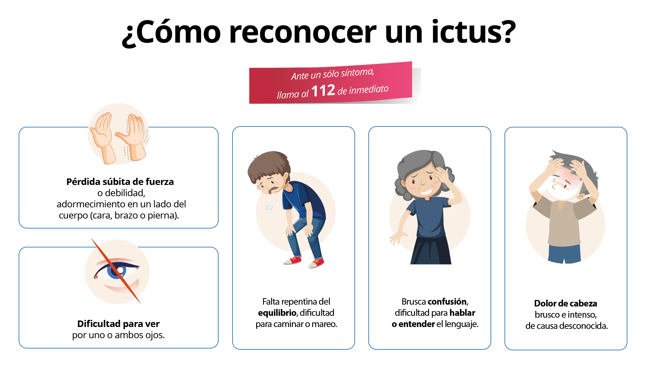 Cuanto antes reciba atención médica la persona afectada, mejor será su evolución. Por eso, si detectas cualquiera de los síntomas de alarma, llama al 112 de inmediato. Hay que solicitar atención sanitaria, aunque desaparezcan. Y recuerda: ¡El tiempo es importante!