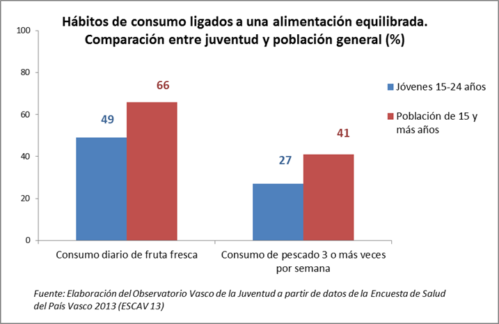 Al preguntar a la juventud vasca de entre 15 y 24 años por su consumo habitual de ciertos tipos de alimentos, tan sólo la mitad del colectivo joven (49 %) señala consumir fruta fresca a diario, y son menos de un tercio (27 %) quienes señalan seguir las pautas recomendadas de consumo de pescado, tres o más veces por semana.
