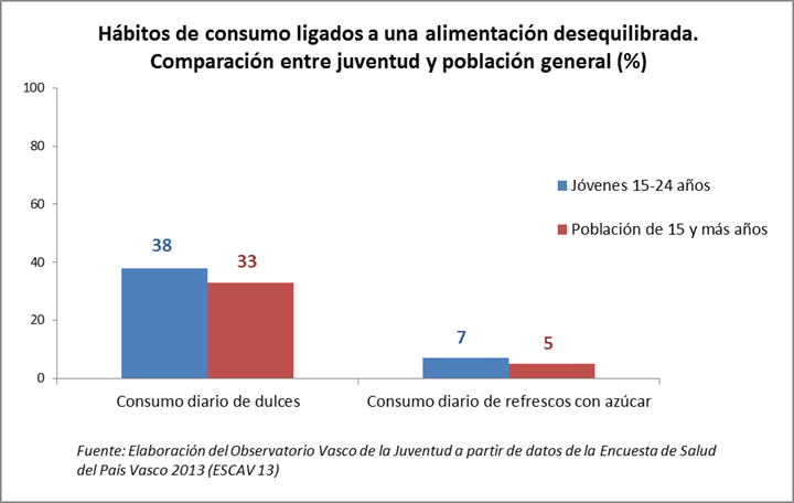 El Observatorio Vasco de la Juventud ha tomado estos datos sobre el consumo de distintos tipos de alimentos de la Encuesta de Salud del País Vasco de 2013 (ESCAV 2013), elaborada por el Departamento de Salud del Gobierno Vasco.