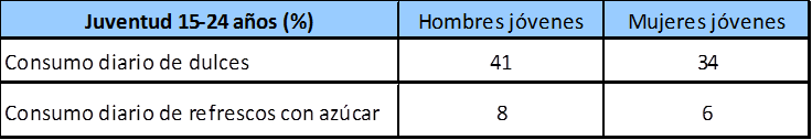 Mientras que en el consumo de fruta y pescado apenas se aprecian diferencias entre chicos y chicas jóvenes, en el caso de los dulces y refrescos con azúcar se constata que su consumo diario está algo más extendido entre los hombres jóvenes que entre las mujeres jóvenes.