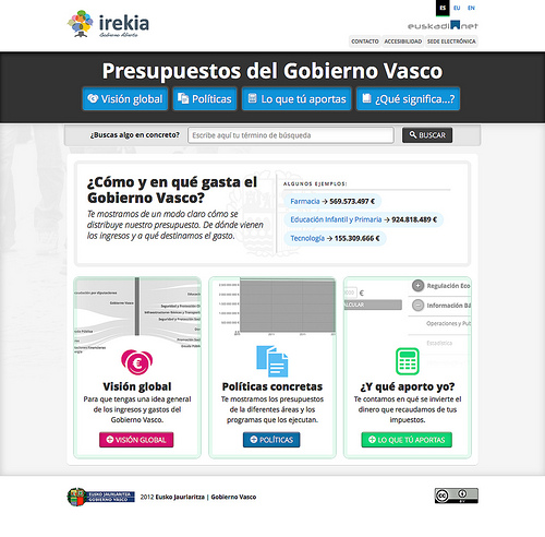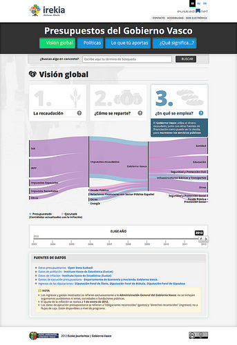 Irekia ha publicado los presupuestos del Gobierno Vasco en un nuevo formato de visualización gráfica y dinámica que permite ver de manera directa cómo se invierten y reparten el dinero público. La base de Aurrekontuak (http://aurrekontuak.irekia.euskadi.net) son, principalmente, los datos que ya se publicaron en Open Data Euskadi, pero re-empaquetados en un interfaz visual.