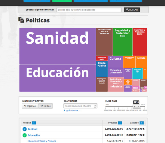 - Políticas, donde podrás acceder al detalle de los ingresos y de los gastos. Por ejemplo: además de la cifra global del presupuesto de Sanidad, como está disponible cada partida que corresponde a ese área, podemos saber la partida que le corresponde a Salud Pública e informarnos de para qué se gasta ese dinero.