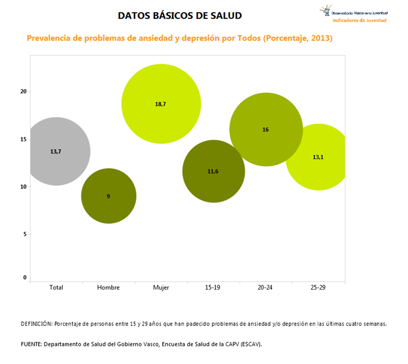 Según datos de la ESCAV (Encuesta de Salud de la Comunidad Autónoma Vasca) proporcionados por el Departamento de Salud del Gobierno Vasco, el 13,7 % de la población de 15 a 29 años de la CAPV padeció algún problema de ansiedad y/o depresión en las cuatro semanas anteriores a la realización de la encuesta, cuya última edición corresponde a 2013.
