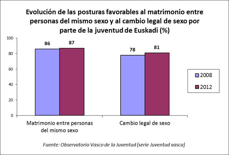 La gran mayoría de las y los jóvenes vascos de 15 a 29 años (87 %) se declara a favor del matrimonio entre personas del mismo sexo y un 81 % a favor del cambio legal de sexo. Estos datos son similares a los registrados en 2008.
