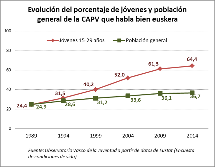 En 2014 el 64,4 % de las personas jóvenes de la CAPV de entre 15 y 29 años afirman hablar bien euskera. Este porcentaje ha experimentado una evolución notable en los últimos 25 años, pasando del 24,4 % en 1989 al 64,4 % en 2014.