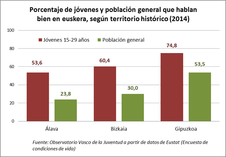 El porcentaje de jóvenes que dicen hablar bien euskera es mayor en Gipuzkoa (74,8 %) que en Bizkaia (60,4 %) y en este último territorio mayor que en Álava (53,6 %).