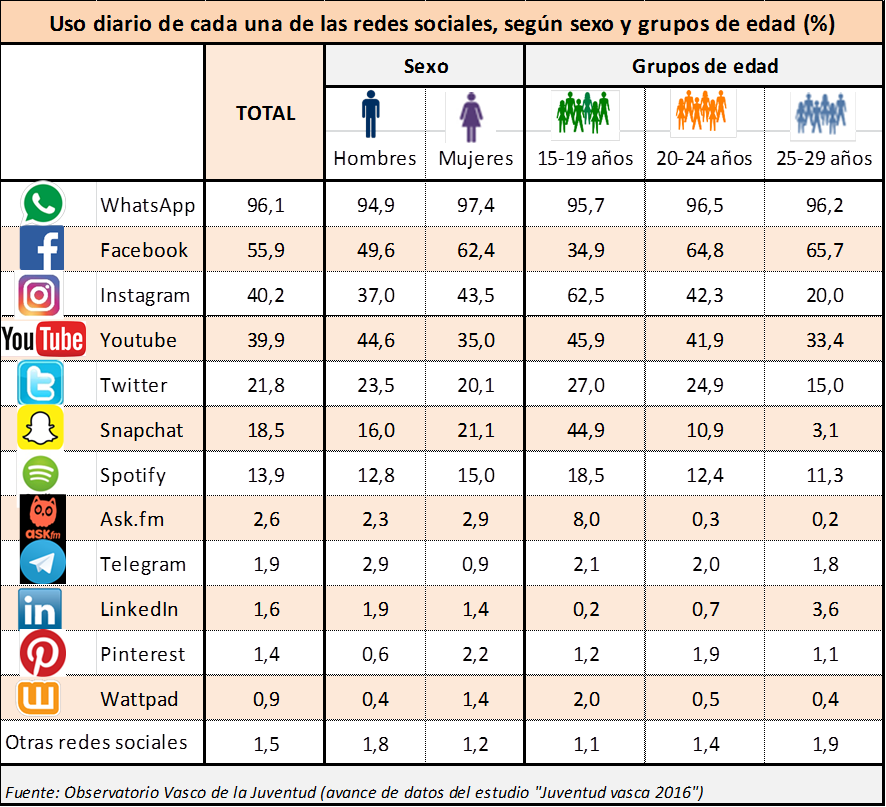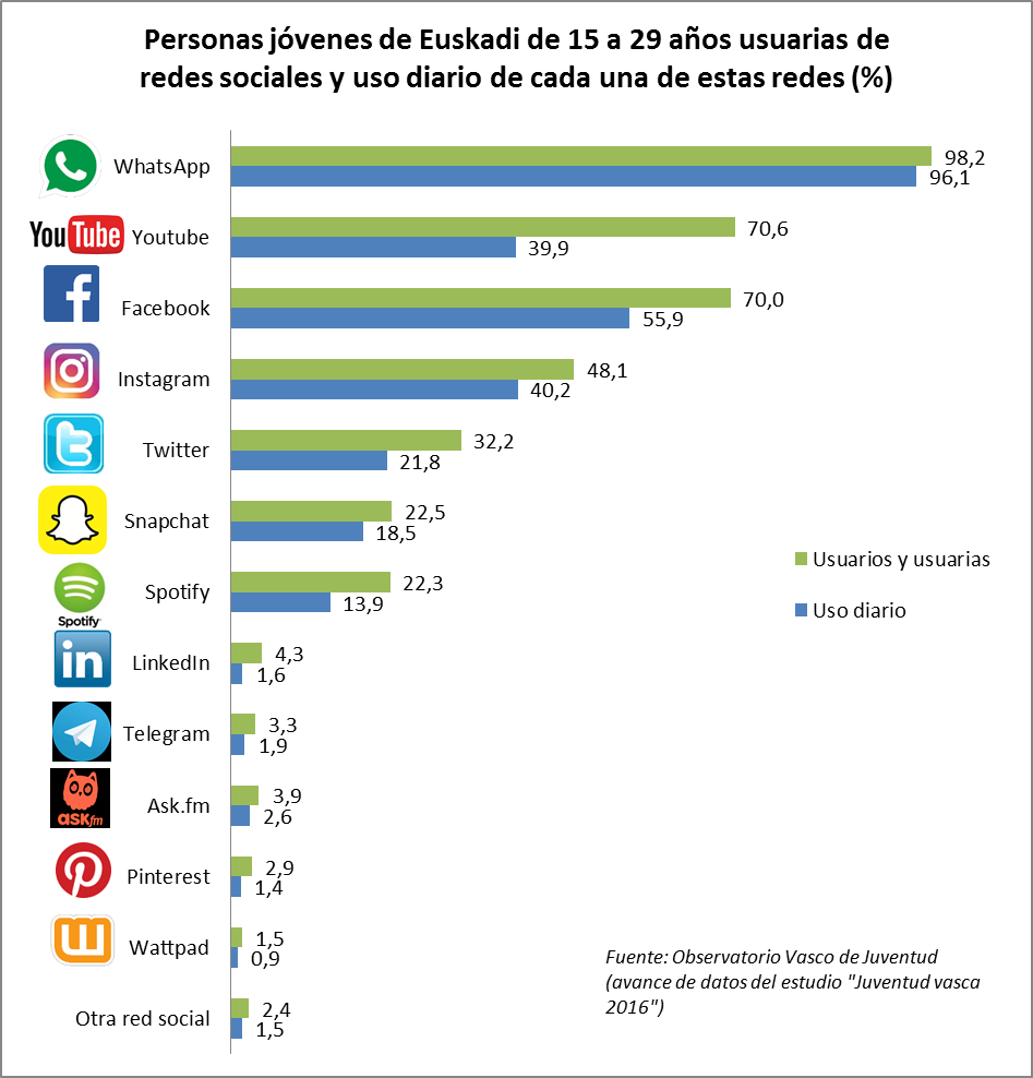 - Las redes sociales a las que más se conecta a diario la juventud de Euskadi son WhatsApp, Facebook, Instagram y Youtube