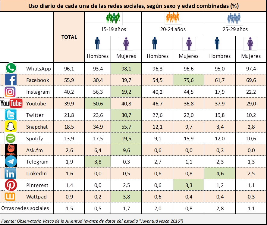 Las chicas de 15 a 19 años son las grandes “consumidoras” de las redes sociales, ya que este colectivo es el que más se conecta a siete de las doce redes propuestas: WhatsApp, Instagram, Snapchat, Twitter, Spotify, Ask.fm y Wattpad (en orden de mayor a menor conexión diaria).