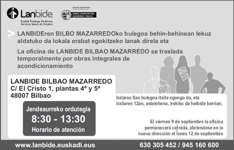 El próximo lunes 12 de septiembre Lanbide abrirá esta oficina en otra ubicación: C/ El Cristo, nº 1, plantas 4ª y 5ª, 48007 Bilbao que vendrá a sustituir a la actual de Mazarredo