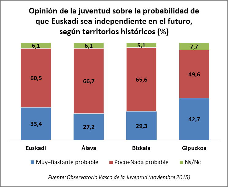 En noviembre de 2015 seis de cada diez jóvenes de Euskadi de entre 15 y 29 años afirmaban que desean la independencia (59,5 %). Más concretamente, un 34,7 % decía que le gustaría mucho que Euskadi fuera independiente y otro 24,8 % señalaba que le gustaría bastante alcanzar la independencia.