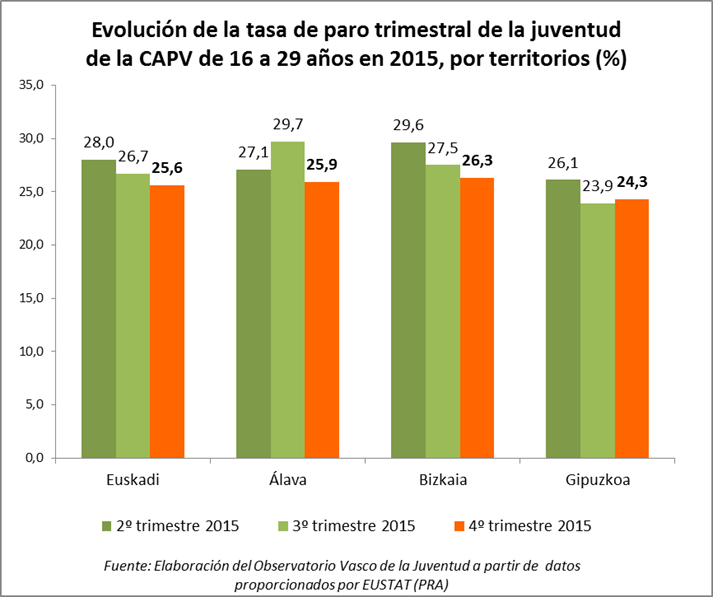 En cuanto a las diferencias entre territorios históricos, Gipuzkoa es el territorio con menor tasa de desempleo juvenil (24,3 %), mientras que Bizkaia se sitúa a la cabeza de la tasa de paro de la juventud (26,3 %). Hay que destacar que en Álava la tasa de paro de la juventud menor de 30 años ha descendido casi cuatro puntos del tercer al cuarto trimestre de 2015 (del 29,7 % al 25,9 %).