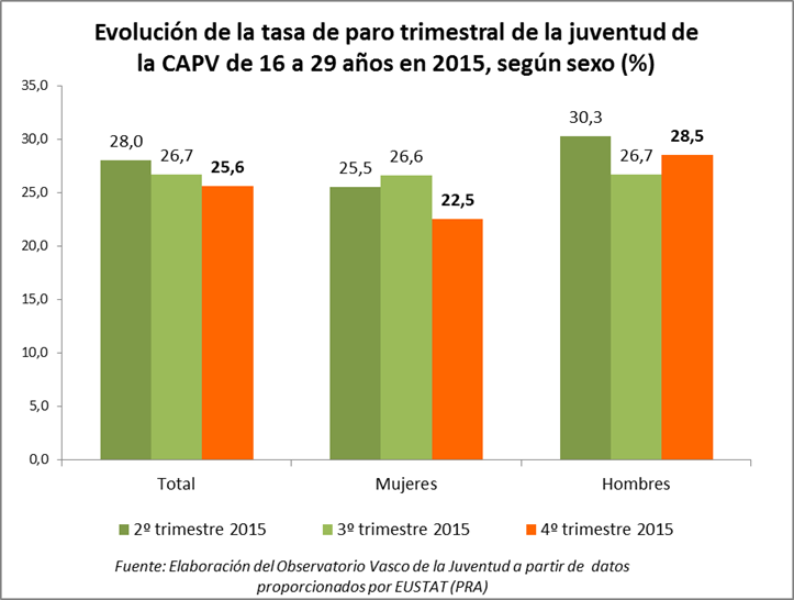 El paro de los hombres jóvenes de la CAPV es mayor que el de las mujeres jóvenes (28,5 % y 22,5 %, respectivamente) en el cuarto trimestre de 2015. La evolución de la tasa de paro no ha seguido el mismo comportamiento entre los hombres y las mujeres jóvenes. Del tercer al cuarto trimestre ha aumentado el paro entre los hombres mientras que ha disminuido entre las mujeres, con un descenso de cuatro puntos porcentuales.