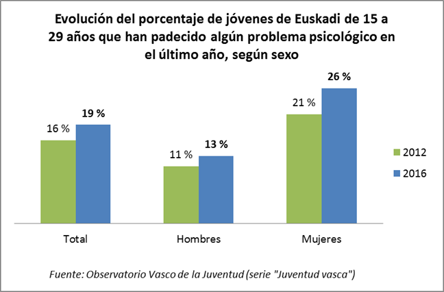 Las cifras de jóvenes que reconocen haber tenido algún problema de ansiedad, estrés, depresión, etc., se han incrementado ligeramente respecto a 2012, cuando el porcentaje general era del 16 %. El mayor incremento corresponde a las mujeres, entre las cuales la prevalencia de estos problemas psicológicos ha pasado del 21 % al 26 %.