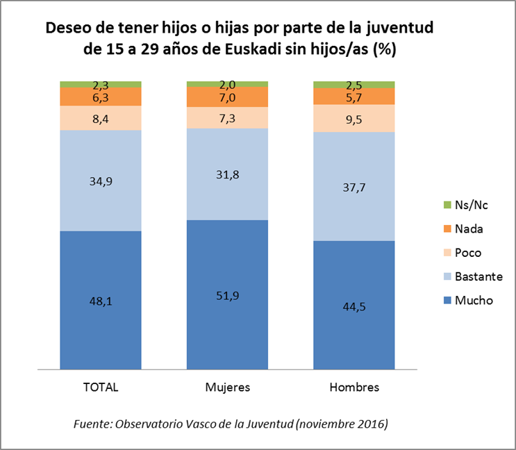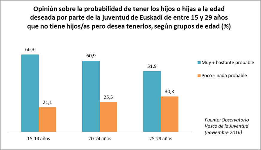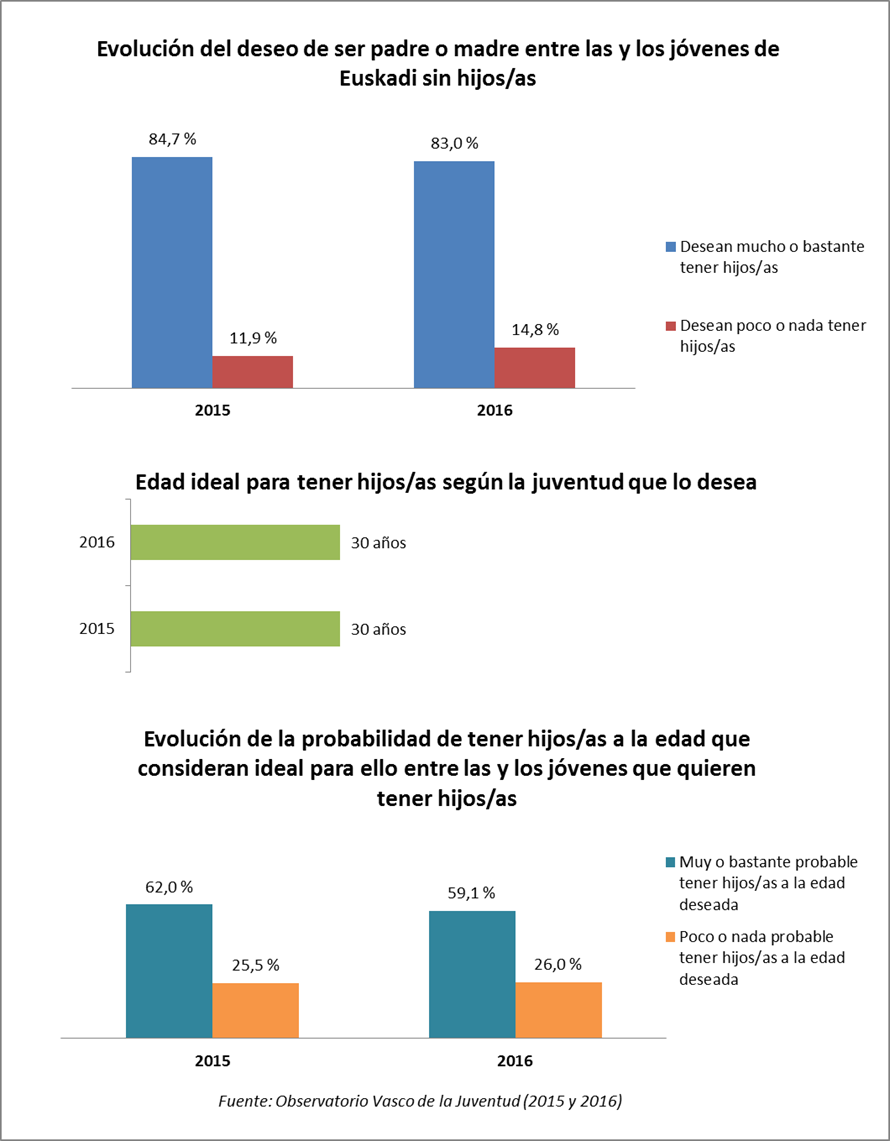 Si comparamos estos datos con los recogidos un año antes en la edición anterior de la misma encuesta, vemos que los deseos y expectativas de la juventud permanecen prácticamente igual. A finales de 2015 el 84,7 % de la juventud sin hijos ni hijas expresaba su deseo de tenerlos; la edad que estos y estas jóvenes estimaban ideal para ello era a los 30 años, en el caso de los chicos, y a los 29 en el de las chicas; y una cuarta parte del colectivo de quienes declaraban querer tener hijos o hijas (25,5 % exactamente) consideraba improbable tenerlos a la edad deseada.