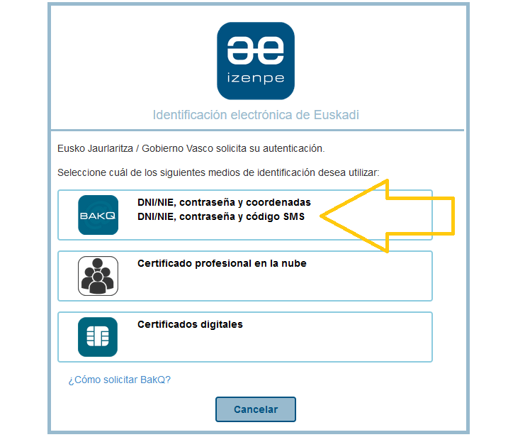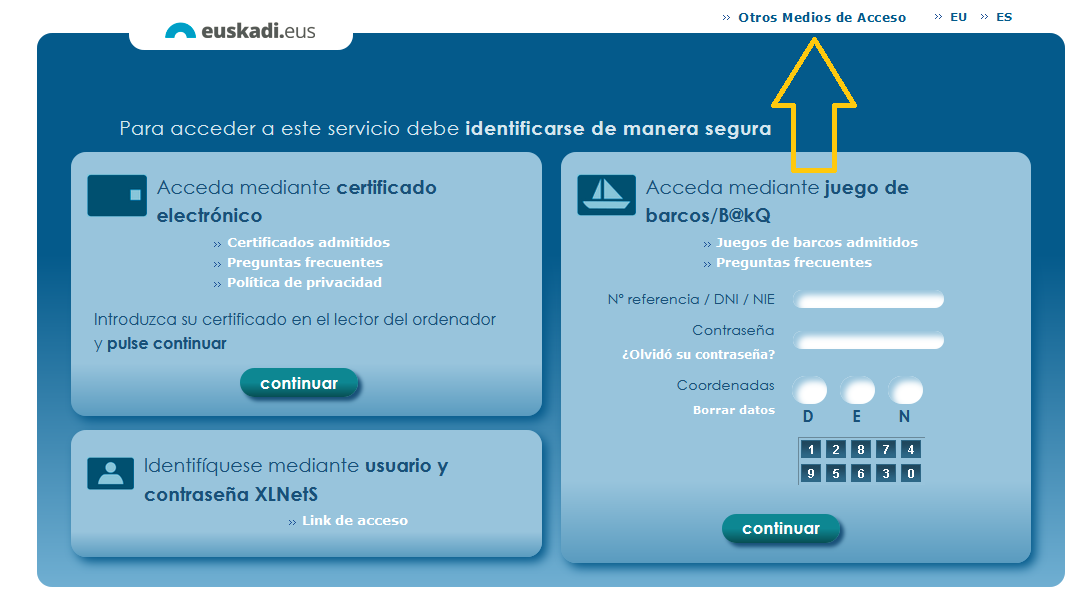 Para poder acceder sin problemas con cualquiera de las dos opciones debes pulsar en el enlace de la esquina superior derecha donde pone "Otros medios de identificación"