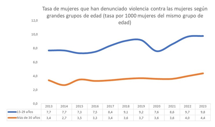 Las tasas de mujeres que han denunciado violencia machista, calculadas por 1.000 mujeres de su mismo grupo de edad, nos muestran grandes diferencias entre la franja de edad de 15 a 29 años y las mujeres de 30 o más años (9,8 ‰ y 4,4 ‰ respectivamente).