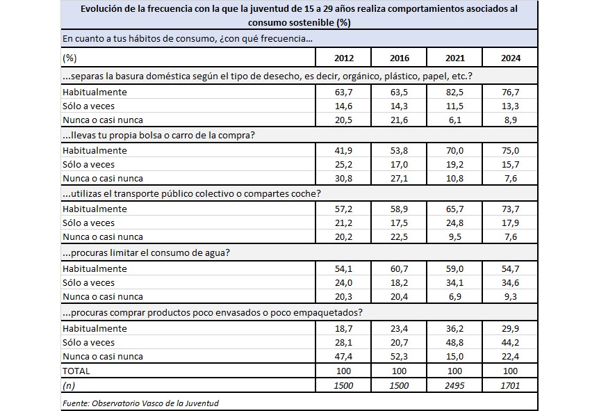 El reciclaje, es decir, separar las basuras domésticas según el tipo de desecho es realizado habitualmente por el 76,7 % de las personas de 15 a 29 años y este porcentaje convierte a este hábito en el más practicado de los cinco investigados. Llevar su propia bolsa o carro de la compra es el segundo hábito de consumo sostenible más frecuente entre las personas jóvenes de Euskadi, ya que el 75,0 % de las personas entrevistadas afirman hacerlo habitualmente. El