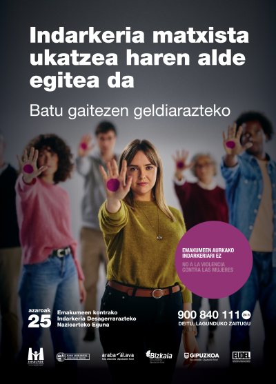 Emakunde, las diputaciones forales de Araba, Bizkaia y Gipuzkoa y EUDEL firman este año una campaña conjunta que anima a la ciudadanía a unirse para frenar la violencia machista ante la creciente corriente de negacionismo. El lema de la campaña "Negar la violencia machista es una forma de apoyarla. Unámonos para pararla" interpela a la ciudadanía para hacer frente a un avance de discursos que banalizan la violencia contra las mujeres.