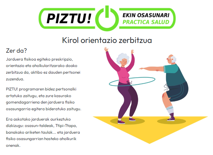 El programa PIZTU! es un servicio de orientación y asesoramiento para la práctica de actividad física dirigido a personas inactivas; ya que son muchas las personas que, por motivos diversos, no son activas y no practican ningúna actividad deportiva.