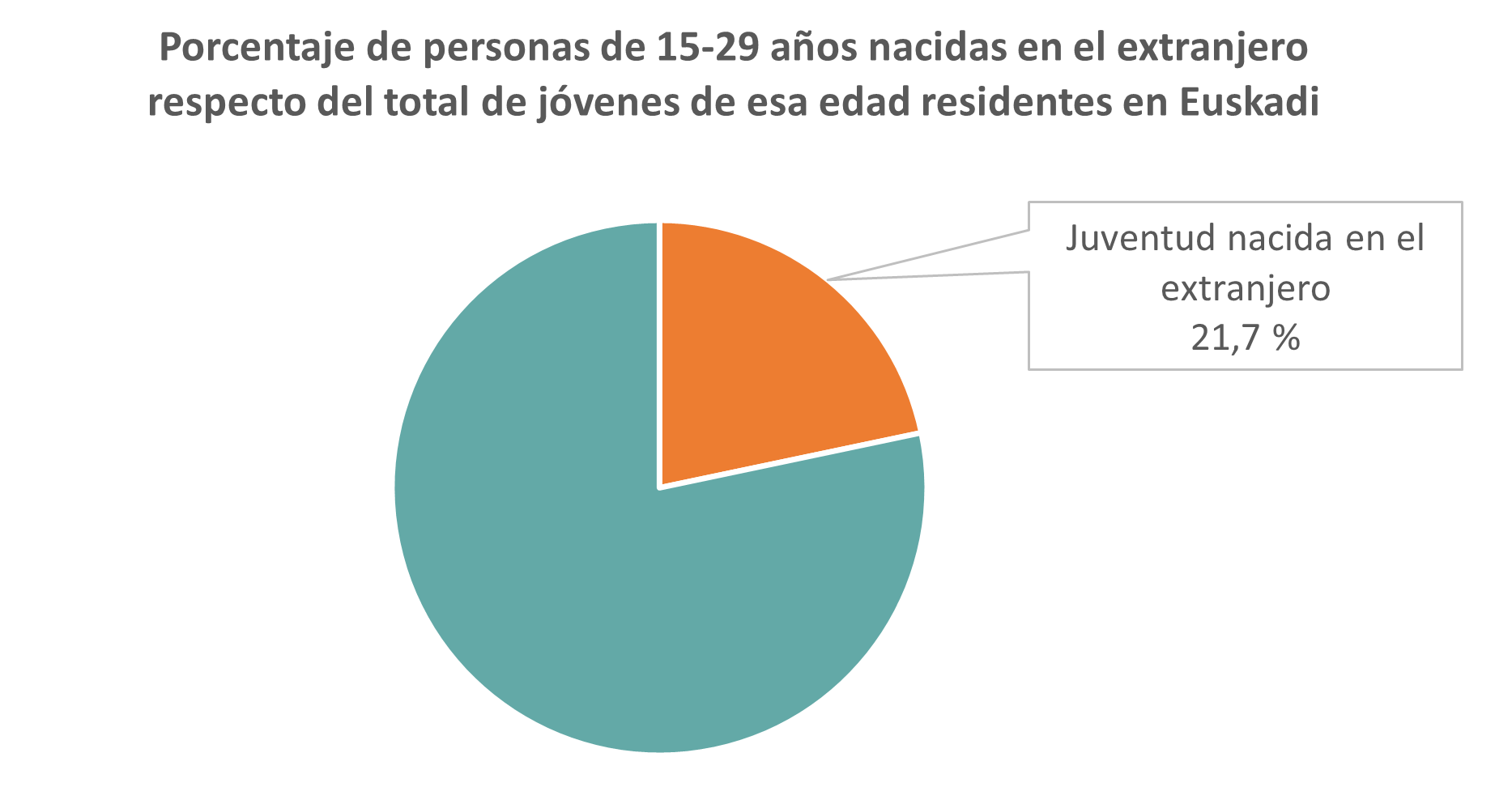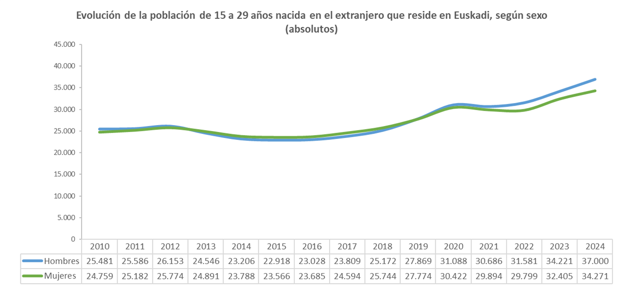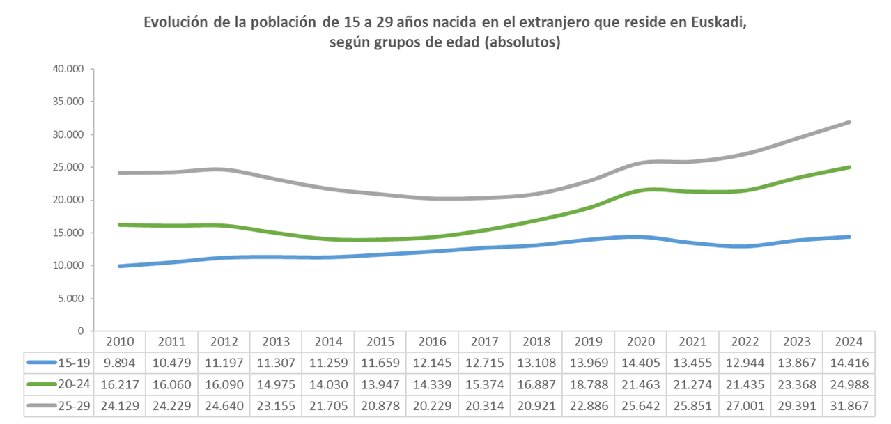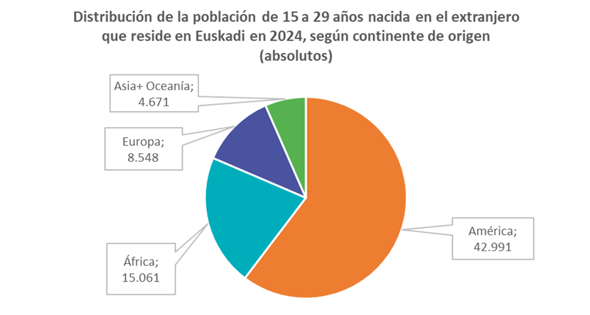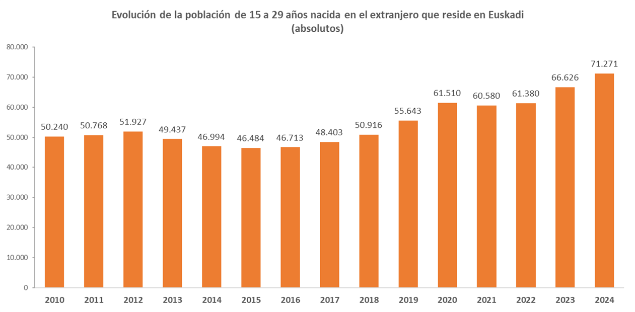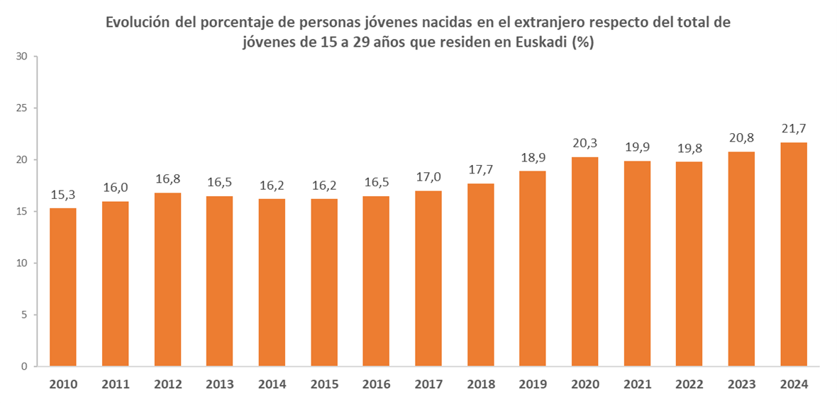 A 1 de enero de 2024, la población joven de 15 a 29 años que reside en Euskadi asciende a 329.093 personas. De ellas, 71.271 nacieron en el extranjero, lo que supone el 21,7 % del total de jóvenes de esa edad. Esa cifra de personas jóvenes nacidas en el extranjero que residen en Euskadi es la más alta registrada hasta el momento, tanto en términos absolutos como porcentuales.