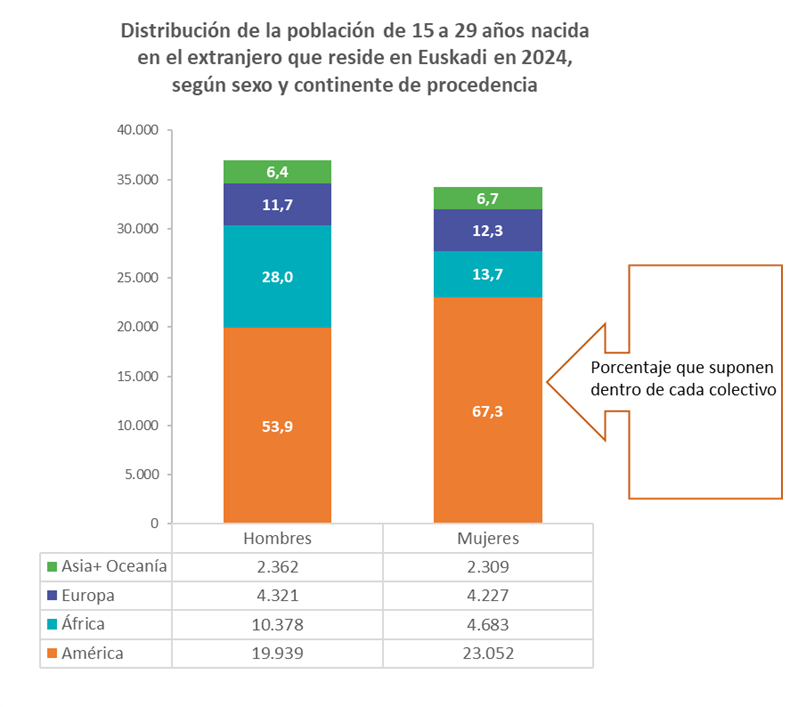 El volumen de mujeres jóvenes que proceden de América es superior al de hombres (la diferencia es de alrededor de 3.000 mujeres más que hombres). En términos relativos podemos decir que dos de cada tres mujeres nacidas en el extranjero que residen en Euskadi proceden de América (67,3 %).